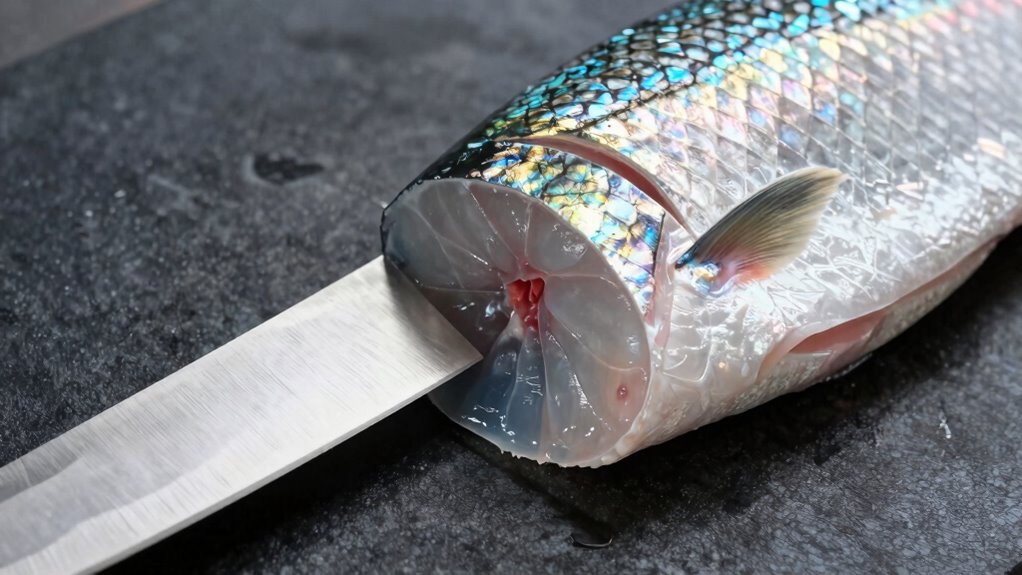 Matching your fillet knife to the specific fish and task at hand guarantees cleaner cuts and minimizes meat loss. You need to contemplate fish size, bone structure, and the job’s detail. For small fish like perch or trout, use a 5-6 inch flexible blade for delicate, precise cuts. Medium-sized fish such as salmon or snapper call for a 7-8 inch blade that balances control and flexibility. Larger fish like catfish or tuna need an 8-12 inch stiffer blade to handle tough skin and bones. Visualize slicing smoothly along a salmon fillet, carefully maneuvering around bones, or peeling back the skin of a delicate trout. Your choice influences control, efficiency, and meat preservation, making tailored selection essential for top-quality results.