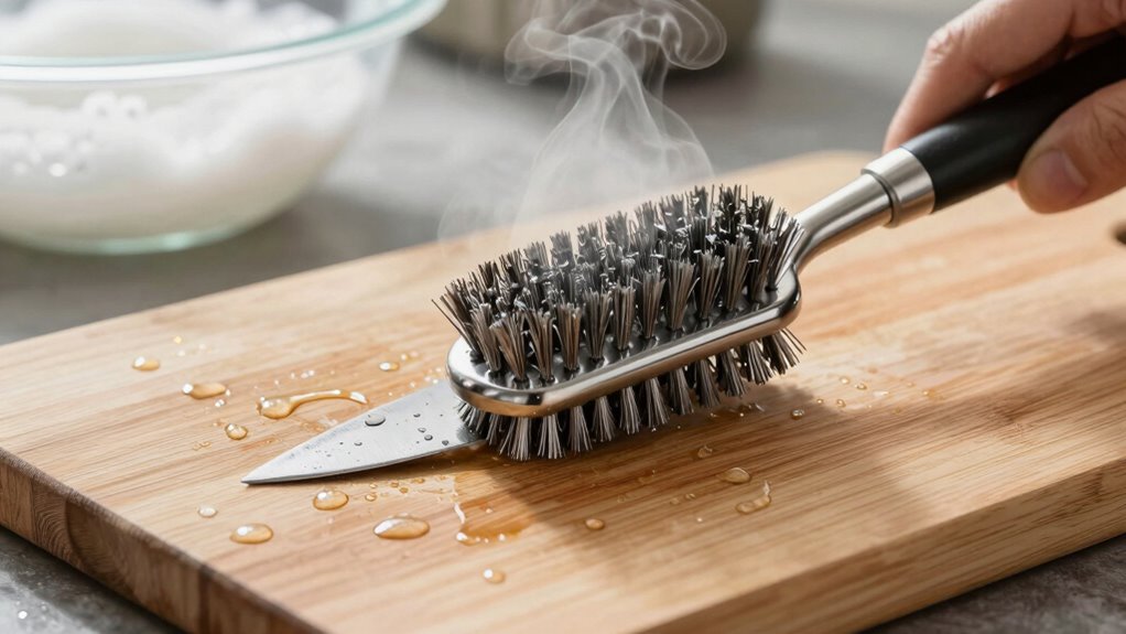 Just like a knight tends to their sword, your board needs care to stay sharp and safe. By following these simple steps, you protect your edges and keep bacteria at bay. Think of it as your secret weapon in the kitchen—maintaining it guarantees every cut is precise and hygienic. With regular upkeep, your board will serve you well, standing the test of time just like a legendary blade. Keep it clean, keep it sharp.