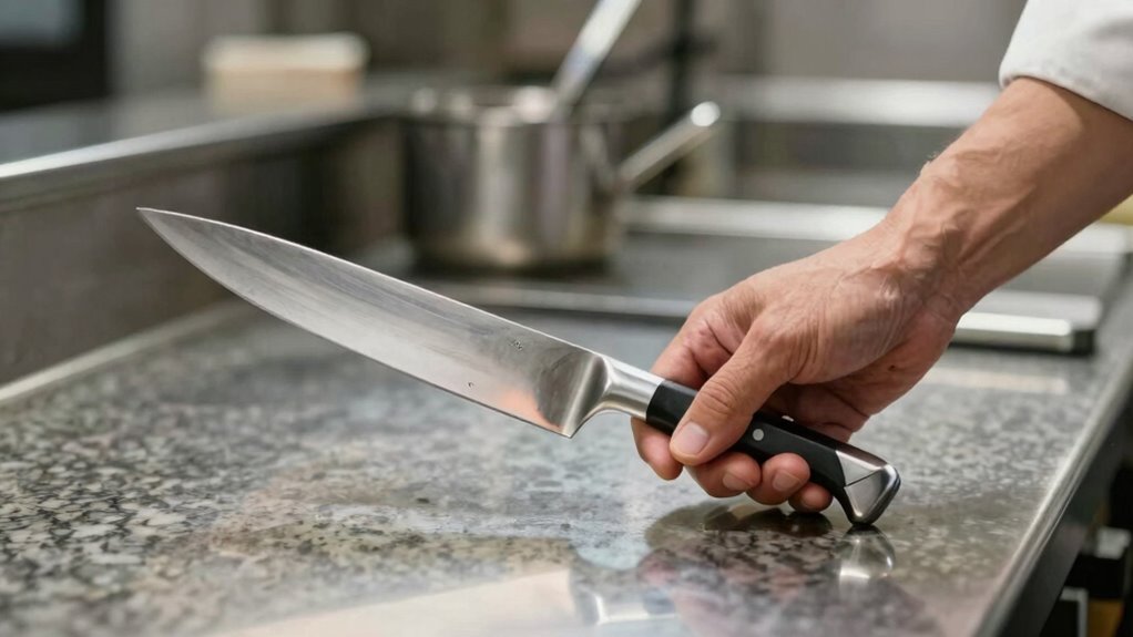 Handing a knife safely is vital to prevent accidents and injuries in the kitchen. When you’re transferring a knife from one person to another, proper technique guarantees everyone stays safe. The key is to establish a clear, predictable process that minimizes the risk of slips or cuts. One effective method is the counter-set approach, where the knife is positioned securely on the counter before the hand-off. Before you initiate the transfer, make sure your knife grip is firm yet controlled, catching the handle comfortably with your dominant hand. Your fingers should wrap around the handle, with your thumb resting along the side for added stability. Avoid gripping the blade itself, as this increases the chance of accidental cuts and reduces control.