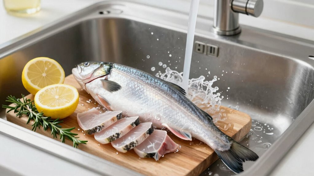 After you finish cutting raw fish, think of your cleaning routine as the final brushstroke on a masterpiece. Rinse the surfaces thoroughly with warm water and a mild vinegar solution to banish lingering odors. Wipe everything down, ensuring no traces remain. This simple act transforms your space from a battlefield of smells into a fresh, inviting kitchen. With just a little effort, you’ll keep your kitchen as pristine as a clear blue sky after a storm.