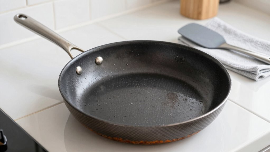 Proper cleaning and drying are essential steps in preventing rust on carbon steel. Consistent cleaning routines remove food residues and moisture that can promote oxidation. Use warm water and a gentle brush or sponge to clean your cookware promptly after each use. Avoid harsh detergents that may strip the seasoning layer. Dry your cookware thoroughly using drying methods such as towel drying or placing it on low heat on the stove to evaporate any remaining moisture. Never leave it wet or damp, as moisture accelerates rust formation. Pay close attention to crevices and corners where water can accumulate. Regular maintenance and seasoning techniques strengthen the protective layer on your cookware, making it more resistant to rust. Additionally, applying a thin layer of oil after drying can create a barrier against moisture and oxidation, further protecting your cookware. Ensuring proper storage practices also plays a vital role in preventing oxidation by ensuring your cookware remains dry and well-maintained between uses. Incorporating proper ventilation in your kitchen can also help reduce indoor humidity and minimize rust risk. By maintaining effective cleaning routines and ensuring complete drying, you markedly reduce the risk of orange rust developing on your carbon steel cookware.