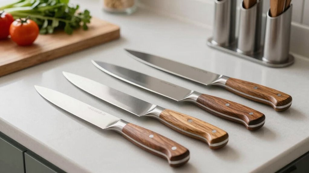 While sticking to a budget helps you focus on buying quality knives, it’s important to look beyond brand names and evaluate the actual craftsmanship. Focus on the knife’s construction, balance, and handle comfort. A well-made knife will stay sharp longer and require less frequent knife sharpening. Pay attention to the blade material—high-carbon stainless steel often offers durability and edge retention. Consider how you’ll store your knives; proper knife storage prevents damage and maintains sharpness. Check for smooth, secure handles without cracks or rough spots. Finally, good craftsmanship ensures your knife can handle daily use and be safely stored. Investing in quality knives means you’ll spend less time on knife storage repairs and sharpening, making your kitchen tasks more efficient and enjoyable.