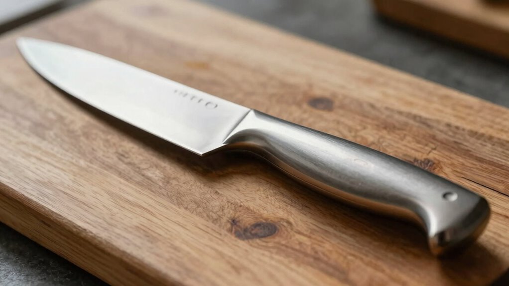 Full tang design can make knife maintenance and sharpening easier because it offers better handle stability and blade balance. With a full tang, the blade stays more securely aligned, reducing wear on the handle and ensuring consistent sharpening. You’ll find that a full tang knife resists wobbling during use, which helps maintain its edge longer and makes sharpening more straightforward, ultimately extending the knife’s lifespan.