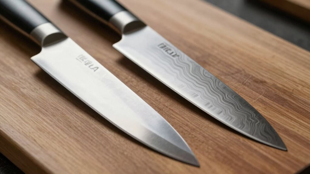 While both German and Japanese chef knives are designed for precision, safety considerations vary due to their differing constructions. You need to be mindful of handling techniques and storage to prevent accidents. Japanese knives, often thinner and sharper, require careful attention during use and sharpening techniques to avoid slips. German knives, with their sturdier build, are more forgiving but still demand proper grip and cutting angles. Proper knife storage is essential: use a knife block or magnetic strip to prevent dulling and accidental cuts. Keep your blades sharp; dull knives increase the risk of slips. Always cut away from your body and use a stable cutting surface. Regularly inspect and maintain your knives to guarantee safety during every use.