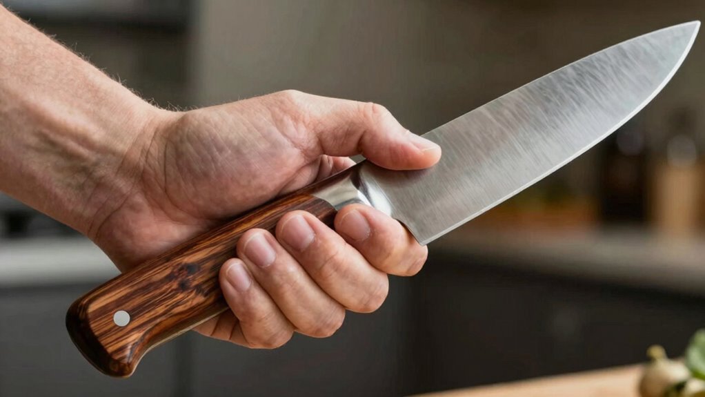 Choosing the right-sized knife is essential for both safety and efficiency in the kitchen. When you’re selecting a knife, one of the most important factors to contemplate is how well it fits your hand. A knife that’s too large can make chopping and slicing feel awkward, increasing the risk of slips and injuries. Conversely, a well-sized knife allows you to maintain control and work comfortably for longer periods. To determine if a knife is too big for you, start by examining your knife grip. If your grip feels strained or your hand cramps after a few minutes, it’s a sign the knife might be oversized. Your grip should be firm but relaxed, with your fingers wrapped comfortably around the handle. If your hand feels stretched out or you’re squeezing tightly just to hold the knife, it indicates a mismatch in hand size compatibility.