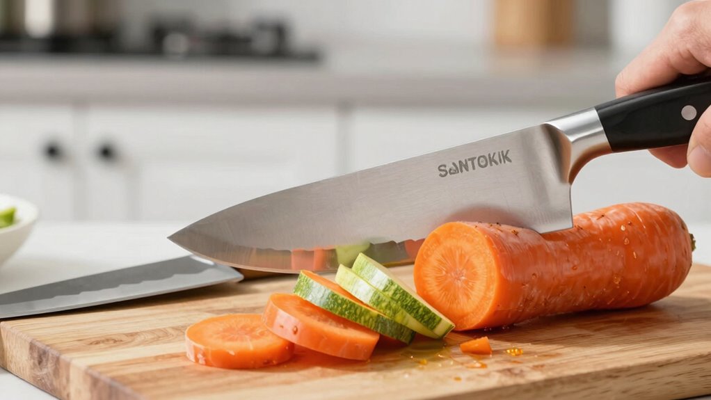- Santoku offers versatility with rocking, slicing, and dicing techniques, suitable for a variety of vegetable preparations.