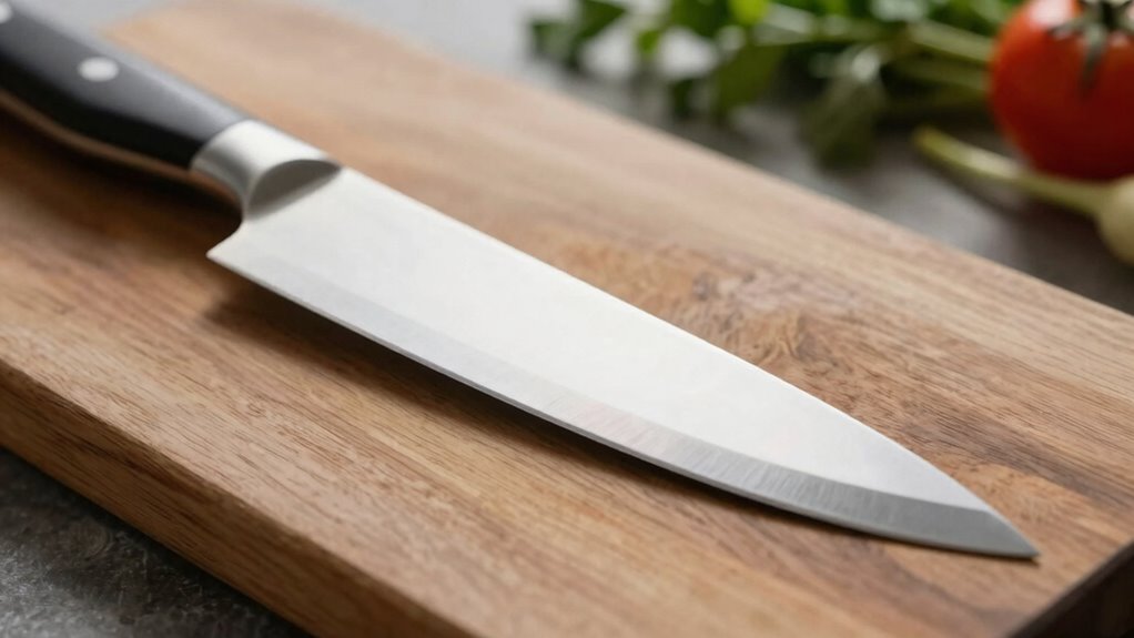 When choosing a kitchen knife, you might assume that a thinner blade always means better performance, but there’s a hidden tradeoff at play. Thin blades are often praised for their precision and effortless slicing, but they come with compromises that can affect your overall experience. Two key factors to contemplate are blade durability and edge retention. While a thinner blade may cut more easily, it’s typically more fragile and prone to damage if not handled carefully. This fragility is especially relevant when considering the material properties of the steel used, which can significantly influence these traits, further complicating the decision. Edge retention is another critical aspect influenced by blade thickness. Thinner blades tend to lose their sharpness faster because their edge is more delicate and susceptible to dulling through regular use. You may find yourself needing to sharpen your knife more often, which can be inconvenient and time-consuming. Conversely, thicker blades usually maintain their edge longer because they have a sturdier profile that resists dulling. However, this strength can come at the expense of the finesse and precision that thin blades offer, making them less suitable for delicate slicing tasks. The importance of handling techniques also plays a significant role in how well a knife performs over time, especially for thinner blades. Proper technique can help mitigate some vulnerabilities of thinner blades by reducing undue stress during use. The tradeoff becomes even more apparent when you weigh the forgiveness of the blade. A thicker knife provides a bit more forgiveness if you accidentally apply extra pressure or encounter tougher ingredients. It’s less likely to chip or break under stress, giving you a more forgiving tool that can handle a variety of tasks without immediate damage. Additionally, understanding the manufacturing process of your knife can help you better assess its durability and performance over time. Proper care and maintenance can also extend the lifespan of thinner blades and mitigate some of their vulnerabilities. Choosing the right knife often involves balancing these factors. If you prioritize precision and are willing to sharpen more frequently, a thinner blade could serve you well. But if durability and longevity are more important, a slightly thicker blade might be the better choice. Keep in mind that the quality of the steel and manufacturing process also influence these traits, so don’t rely solely on thickness. Ultimately, understanding the hidden tradeoff between thinness and forgiveness helps you select a knife that matches your cooking style and maintenance preferences, ensuring it performs reliably over time.