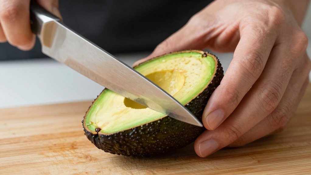 Always use a sharp knife and curl your fingertips inward for safe, controlled avocado cutting.