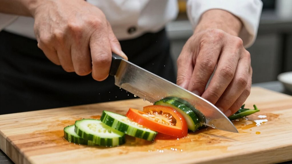 These drills push you to stay focused and adapt quickly, reinforcing muscle memory and safe handling. Always ensure your knives are sharp and your grip is secure. Speed builds confidence, but control and safety come first. Paying attention to technique ensures your skills develop safely and effectively. Additionally, incorporating safe handling practices can further improve your precision and reduce the risk of injury.