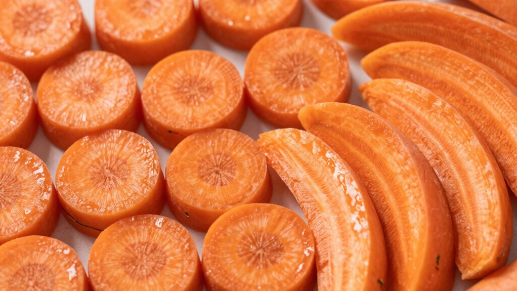 You might think shape doesn’t matter, but it actually affects texture through cutting technique and heat transfer. Thin rondelle slices cook faster and become softer because they expose more surface area, while thicker half-moon slices retain a firmer bite. The shape influences how heat penetrates, so choosing the right cut can help you achieve the perfect vegetable texture for your dish.