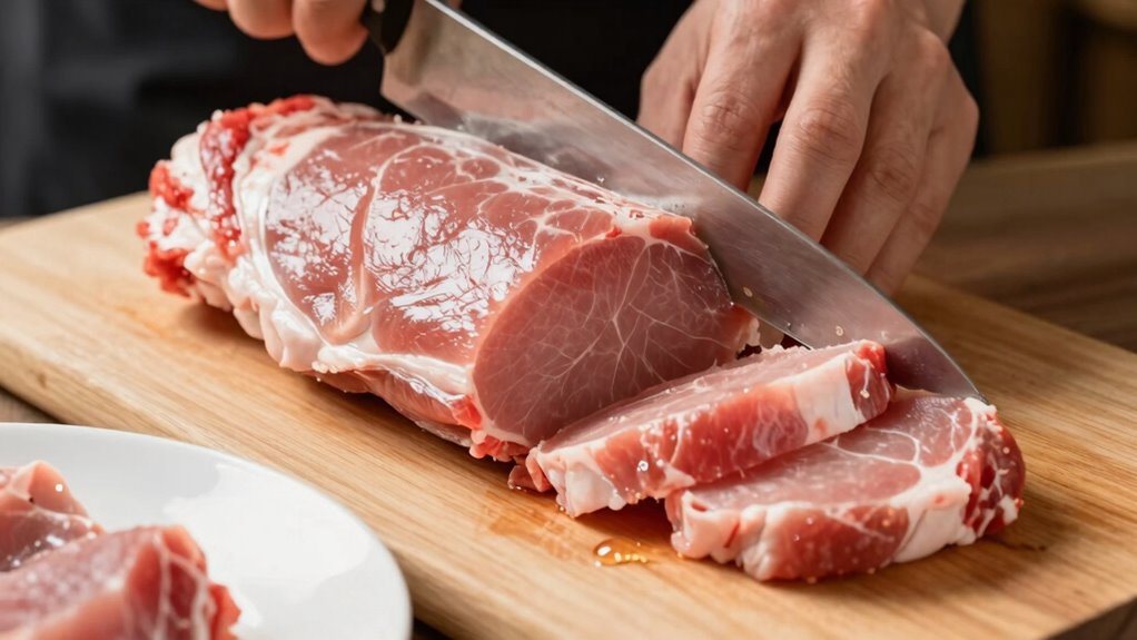 Once trimmed, you can decide how to slice your tenderloin based on your recipe or preference. For even cooking and presentation, slicing against the grain is key. This technique shortens the muscle fibers, resulting in tender, bite-sized pieces. For roasts, you might leave the tenderloin whole, but for stir-fries or sandwiches, sliced thinly. When slicing, keep your knife at a slight angle and make smooth, steady cuts. This not only enhances presentation but also helps your pork cook uniformly, preventing overcooking on the edges while the center remains underdone.