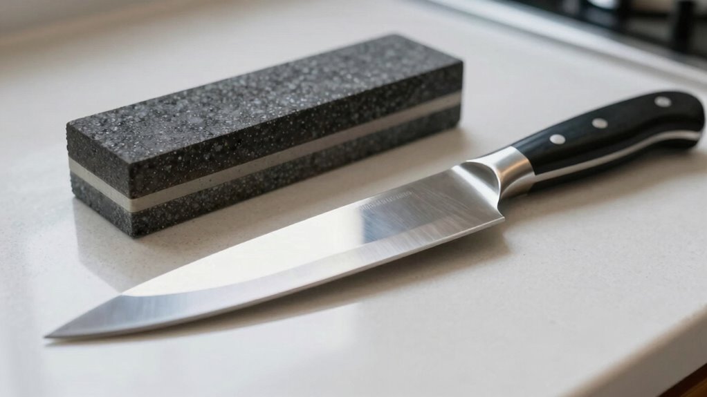 You should hone your kitchen knives every 1-2 weeks to maintain their edge, while sharpening is needed roughly every 6-12 months. Did you know that dull knives cause 67% more accidents? Regular blade maintenance keeps your knives sharp and enhances kitchen safety. Hone more often to keep the edge aligned, and sharpen when you notice a decline in cutting performance. This routine guarantees safer, more efficient food prep.