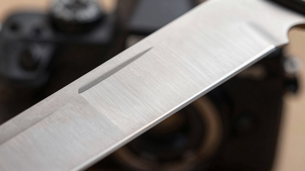 Adding a micro-bevel can considerably improve your blade’s cutting performance, but it’s easy to make mistakes that compromise the edge. One common mistake is overextending the micro-bevel, which can weaken edge durability and lead to quicker dulling. Using improper sharpening techniques, such as applying uneven pressure or not maintaining a consistent angle, can also create an inconsistent bevel that harms the edge. Another error is rushing the process; rushing leads to misaligned angles and a fragile edge. Additionally, neglecting to clean your blade thoroughly before sharpening can cause debris buildup, affecting the micro-bevel’s precision. To avoid these pitfalls, focus on steady, deliberate sharpening techniques, and always maintain a consistent angle to ensure your micro-bevel enhances, rather than damages, your blade’s performance.