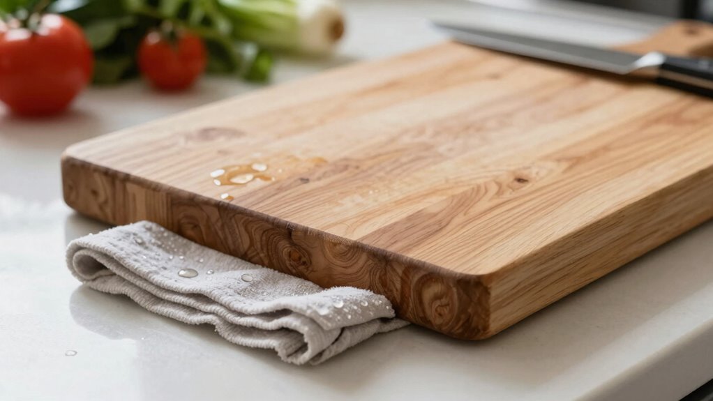 When your cutting board tends to slip, setting it on a wet paper towel can provide immediate grip. The moisture from the wet paper towel increases friction, preventing slipping during your prep work. Simply place a damp cloth or wet paper towel on your countertop, then position the cutting board on top. This creates a textured, wet surface that stabilizes the board effectively. Additionally, surface friction plays a crucial role in preventing movement, making this simple trick highly effective. Here’s a visual to help you imagine the setup: