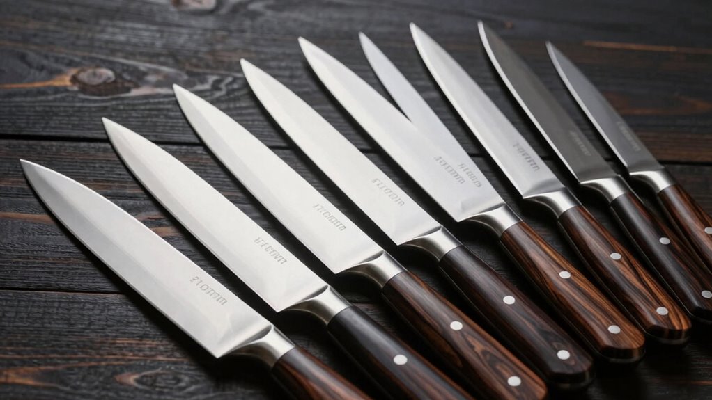 Different steel types dramatically impact how I maintain my knives. High-carbon steels cut sharper but need more care to prevent rust—think of them as a delicate dance partner. Stainless steels are more forgiving, resisting corrosion with less effort, like a reliable friend. Damascus steels combine beauty and durability but require regular honing. Choosing the right steel depends on your patience and how much effort you’re willing to invest in upkeep.
