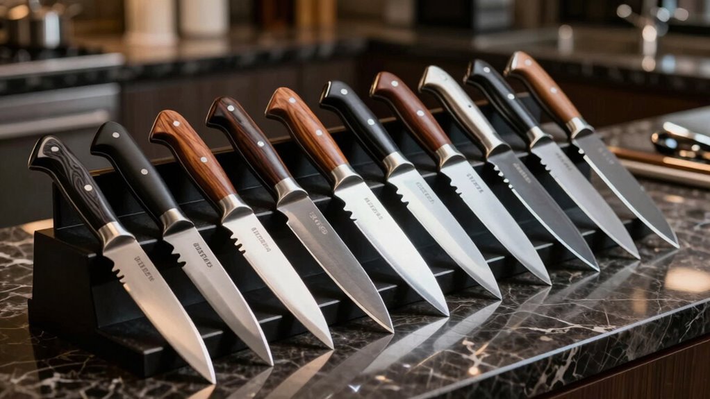 Most of these premium knives come with protective sheaths or offer dedicated storage options, like magnetic bar holders or knife blocks, to keep them safe and sharp. I always recommend storing your knife in a sheath or a designated slot to prevent damage and guarantee safety. If not included, investing in a quality knife guard or a magnetic strip is a smart choice for long-term preservation.
