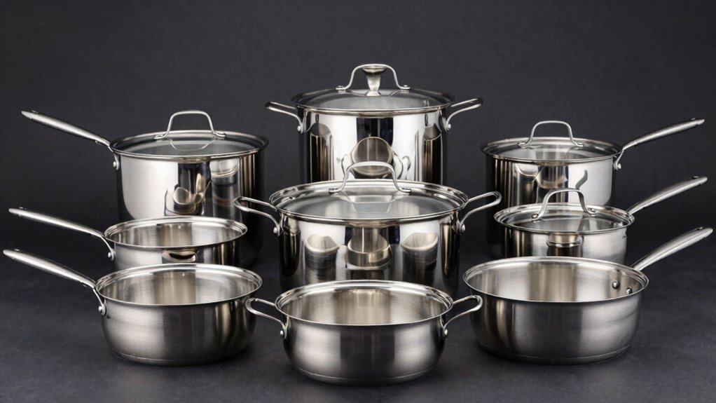 Durability and longevity are vital, but ensuring your cookware is safe and healthy to use is equally important—especially in a professional kitchen. I always check that the set is made from food-grade stainless steel free from toxic materials like PFOA, PTFE, and PFOS, which can pose health hazards. It’s also imperative to verify that the cookware is nickel-free, especially if you or your staff have allergies or sensitivities, to prevent metal leaching. I look for sets that meet safety standards and regulations, ensuring they are heat-resistant and non-toxic. corrosion-resistant stainless steel is a must to keep the cookware hygienic over time. Finally, I avoid chemical coatings, trusting that the stainless steel construction alone safeguards against harmful fumes and chemical breakdown.