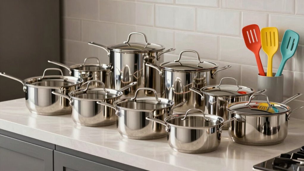 Choosing the right 5 ply stainless steel cookware set is like assembling a trusty kitchen orchestra—each piece plays its part perfectly. With options under $300, you’re revealing a treasure chest of durability and performance without breaking the bank. Imagine your kitchen as a stage where these pots and pans perform culinary magic, turning everyday ingredients into a symphony of flavors. Happy cooking!