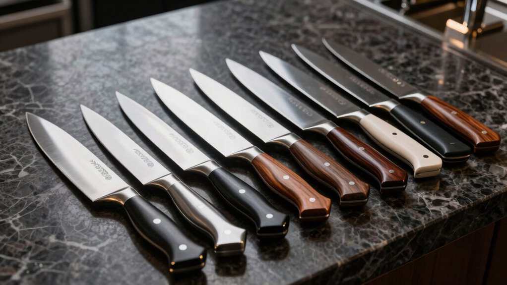 Handle materials might seem like a small detail, but they truly influence how balanced and comfortable a knife feels. I’ve found that wooden handles offer a warm, natural grip, making long prep sessions easier on my hand. Conversely, synthetic handles are lightweight and durable, providing a secure hold even when wet. Ultimately, the right material depends on your grip preference and how you like your knife to feel in your hand.
