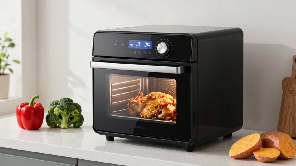Think of an air fryer oven as a vigilant guardian in your kitchen. You should look for safety features like automatic shut-off to prevent overheating, cool-touch exteriors to avoid burns, and non-slip feet for stability. A clear, easy-to-understand control panel helps prevent mishaps. These features act like a shield, ensuring your cooking experience stays safe and stress-free while you enjoy delicious, healthy meals.