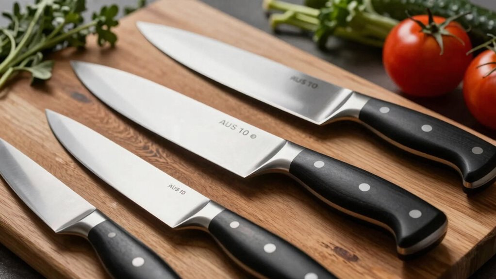Keeping AUS-10 knives sharp is like tending a delicate garden; it needs consistent care. I recommend honing them regularly with a ceramic or steel sharpener to maintain the edge. Periodically, I like to give mine a professional sharpening for a finer edge. Wash and dry your knives immediately after use to prevent rust. With this routine, your AUS-10 knives will stay razor-sharp and ready for any culinary challenge.