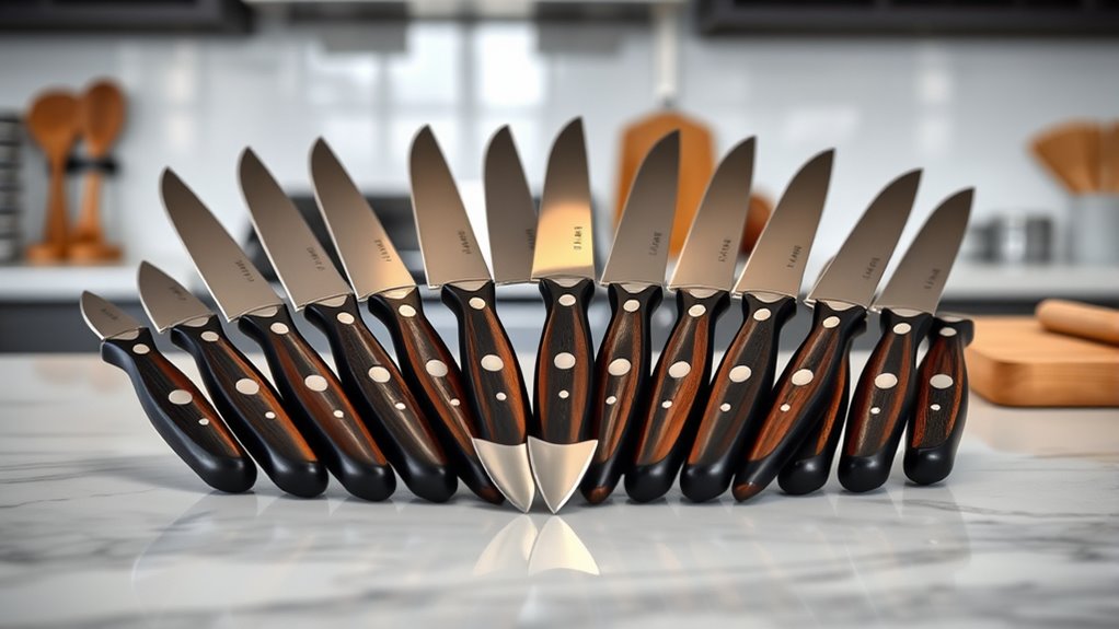 A comfortable and secure grip is essential for precise and safe boning knife use, especially during extended cutting sessions. An ergonomic handle with textured finger points offers a non-slip grip that reduces fatigue and enhances control. Handles made from materials like pakkawood or textured plastic provide comfort and prevent slipping even when wet. The shape of the handle should fit naturally in your hand, allowing for precise control and minimizing wrist strain. A well-designed handle also balances the blade’s weight, improving maneuverability and reducing fatigue. Features like finger indentations or textured surfaces help maintain safety and control during detailed tasks. Prioritizing handle comfort guarantees a safer, more efficient cutting experience, especially during long periods of use.