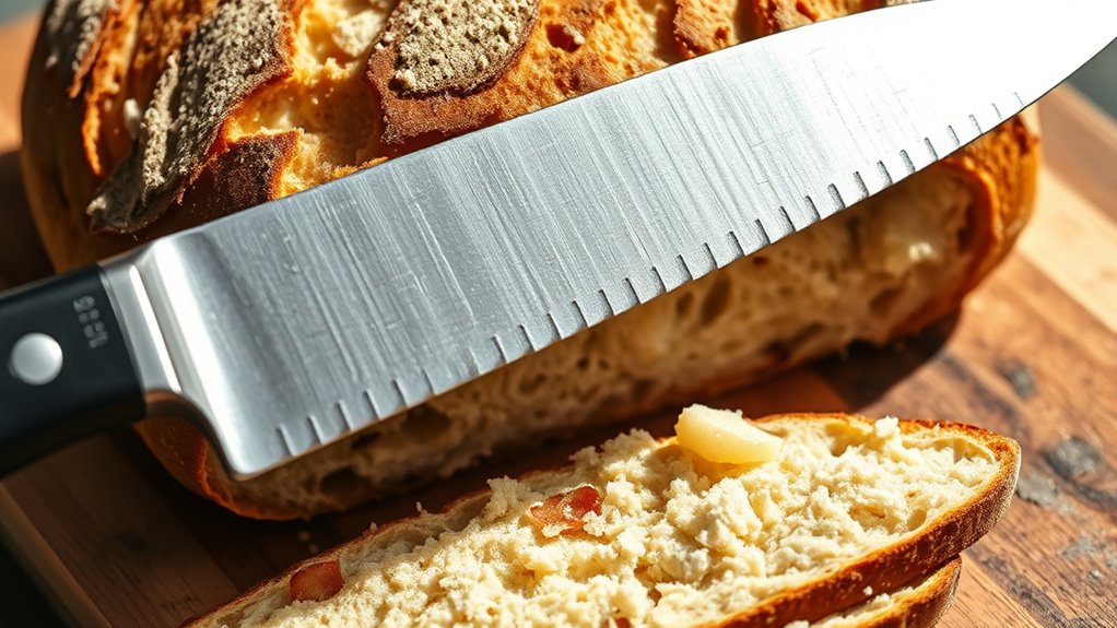 A sharp bread knife is essential for achieving clean, effortless slices through crusty artisan bread, preventing tears and crushing that can ruin both the appearance and texture. The blade’s edge should be finely honed and regularly maintained to stay sharp over time. Serrated blades with scalloped or wavy edges grip the crust effectively, slicing without exerting excessive force. The bevel angle of the blade also matters; angles between 14° and 16° strike a good balance between sharpness and durability. Resharpenable blades are a smart choice, allowing you to restore their razor-sharp edge whenever needed. This ensures consistent performance and easier slicing, making your bread-cutting experience more enjoyable and professional-looking. Sharpness truly makes all the difference with crusty artisan loaves.