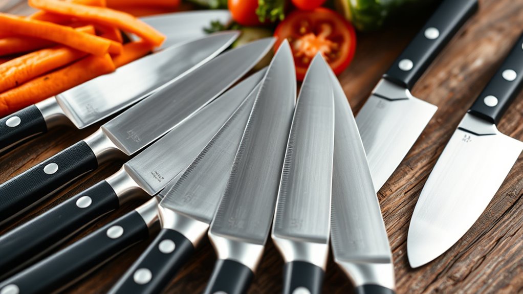 Think of handle materials as the grip to your culinary sword—some feel like a cozy glove, others like a slick paddle. I find that rubber or textured handles give me better control, especially when slicing through firm vegetables. Wooden handles offer warmth and tradition but can be slippery when wet. Ultimately, I choose a handle that feels like an extension of my hand, making every cut smooth and effortless.