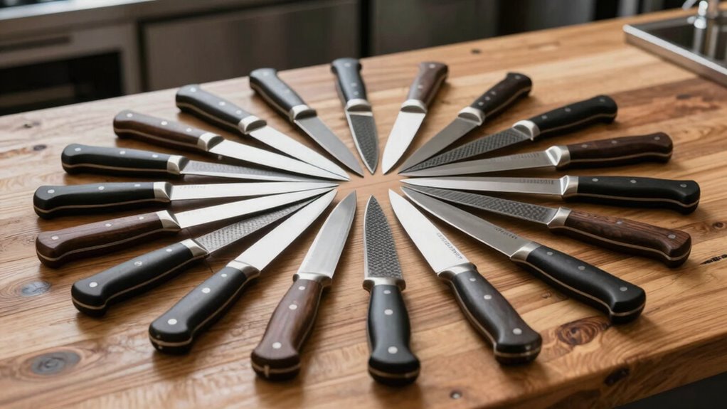 Did you know that around 60% of professional chefs prefer carbon steel knives for their sharpness? I believe carbon steel knives are suitable for beginners, but with some caution. They require regular maintenance to prevent rust and need sharpening more often. If you’re willing to learn proper care, you’ll find their exceptional edge and cutting performance worth the effort. Just start slowly and stay consistent with your upkeep.