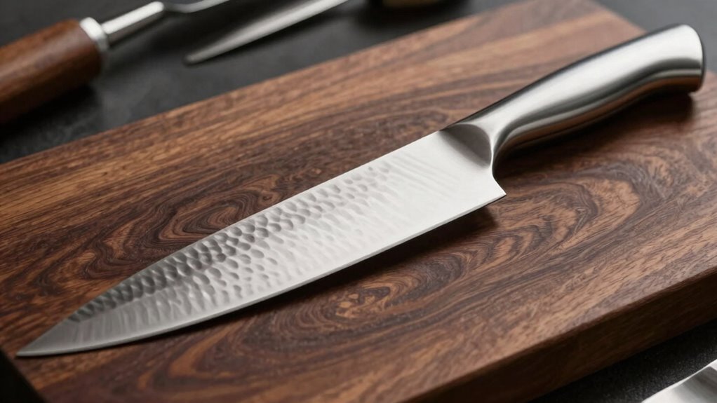 When choosing a chef knife with a Tsuchime finish, I focus on the blade material quality and how well it holds its edge, since durability matters a lot. I also consider the pattern’s authenticity and design, along with handle ergonomics to guarantee comfort during long use. Finally, I pay attention to the knife’s balance and weight to find one that feels just right in my hand.