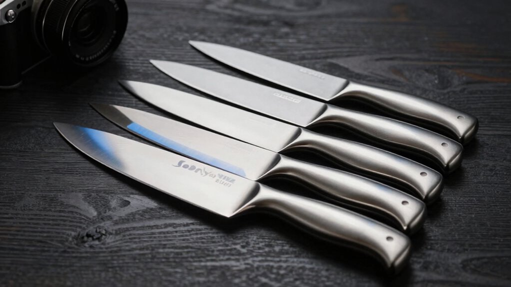 A sharp blade makes all the difference in how smoothly and efficiently I can chop, slice, or julienne ingredients. I look for knives with a bevel angle between 14° and 20°, where lower angles allow for more precise cuts. The steel’s quality and the sharpening process greatly influence the initial sharpness; a well-finished blade glides effortlessly through food. Hand-sharpened blades with a micro bevel at 15° to 20° per side tend to hold their edge longer. Steel hardness impacts edge retention—harder steel stays sharp longer but can be less tough. Regular honing and proper storage are key to maintaining a knife’s edge, but choosing a high-quality steel with a precise grind guarantees it remains sharp through daily use.