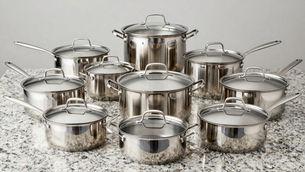 Prices for premium clad stainless steel sets vary wildly, depending on quality, quantity, and brand prestige. Typically, I find that higher-end sets command a hefty, hefty price tag, often reflecting their durability and design finesse. Budget-friendly options exist, but they might lack the luxurious layers or extensive ensembles of the more expensive sets. Ultimately, I recommend weighing your wallet’s willingness against what cookware qualities you truly crave.