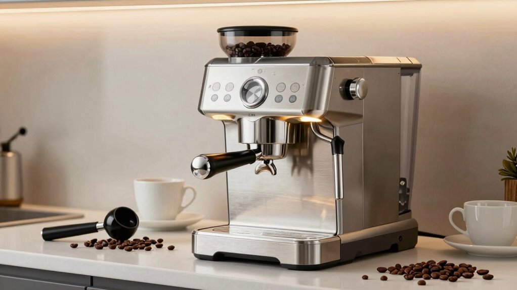 A high-quality coffee grinder is key to revealing the full flavor potential of your beans, especially when shopping for a machine under $500. Burr grinders are essential because they produce consistent particle sizes, unlike blade grinders that can create uneven grounds. Adjustable grind settings let you tailor the texture from coarse to fine, which is vital for different brewing methods like French press or espresso. Most machines offer between 3 to 8 grind levels, giving you plenty of customization. Uniform grind size ensures balanced extraction, preventing over- or under-extraction that can spoil your cup. Durable burr grinders with precise control consistently deliver better results and last longer. Investing in a good grinder quality and versatile settings makes a noticeable difference in your coffee’s flavor and overall experience.