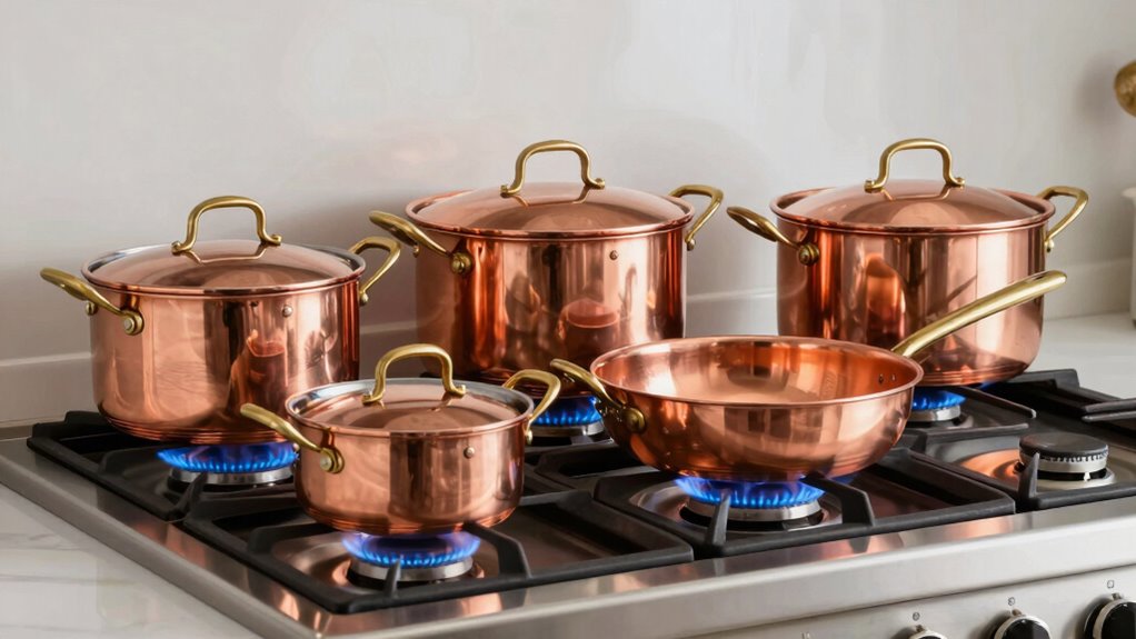 Since copper is renowned for its exceptional heat conduction, guaranteeing even temperature distribution is essential when selecting cookware for gas stoves. I look for sets with a multi-layer construction, where a copper core is sandwiched between other metals, to promote uniform heat transfer. A thick copper base is especially important, as it minimizes hot spots that can cause uneven cooking or burning. The shape and thickness of the pans also matter; flat, thick-bottomed cookware provides more consistent heating across the surface. Additionally, for gas stoves, I prefer copper pieces with a ferromagnetic layer, making them induction-compatible without sacrificing heat distribution. Overall, well-designed copper cookware ensures that heat spreads evenly, giving me precise control and better results in my cooking.