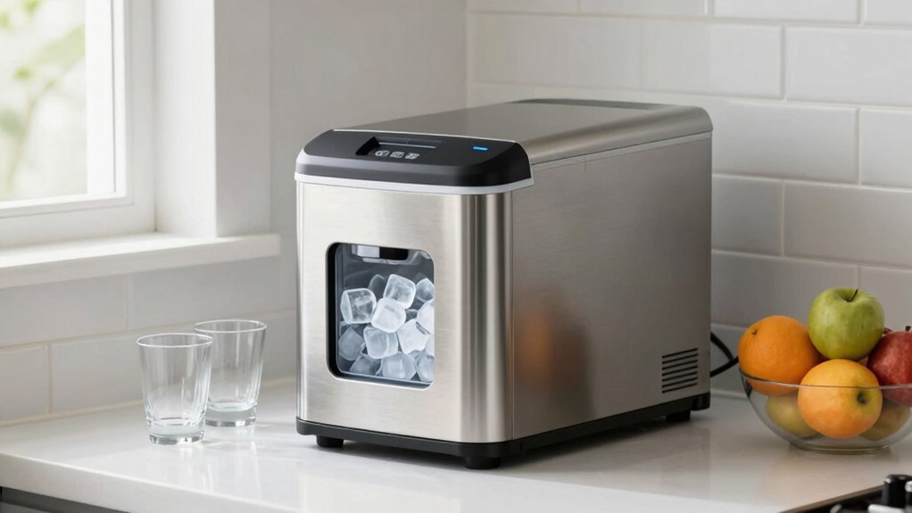 Maintaining a countertop ice maker in a small kitchen becomes much easier when you select a model designed for simple upkeep. Look for machines with self-cleaning functions activated by just a button—this reduces manual effort and keeps the unit hygienic. Indicator lights or alerts for water refills and full ice baskets help you stay on top of maintenance without constant checking. Transparent windows or viewing panels let you monitor ice levels easily, preventing overflows or shortages. Consider models with a cleaning cycle lasting around 15 to 30 minutes, fitting comfortably into your routine. Regular cleaning every 1-2 months is essential to prevent residue buildup, so choose an ice maker with easy access for cleaning and minimal disassembly. This ensures hassle-free maintenance and year-round ice availability.