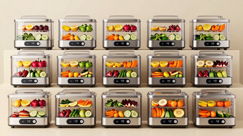 Choosing a dehydrator under $300 means finding a good balance between features and affordability. At this price point, you get essential functions like adjustable temperature controls, typically ranging from 95°F to 165°F, which suit various drying needs. Most models offer 5 to 12 trays, providing enough capacity for batch drying without breaking the bank. When considering value, I look for features like timers, good airflow technology, and solid build quality relative to the price. It’s important to remember that investing under $300 usually means focusing on performance and capacity rather than premium materials or advanced digital controls. This balance ensures you get a reliable dehydrator that meets your needs without overspending, making it a smart choice for budget-conscious consumers.