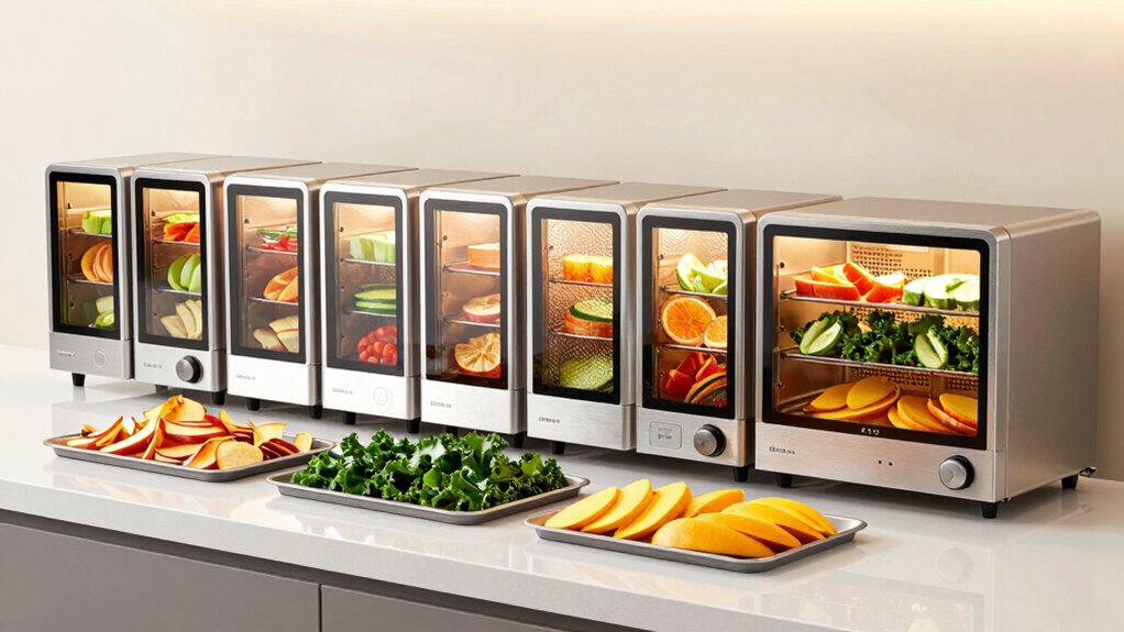 No matter which dehydrator you pick, I promise it’ll make snacking healthier and more fun—like having a tiny, modern version of a medieval kitchen at your fingertips. With so many options, from digital controls to collapsible trays, you’re sure to find one that fits your needs. Just imagine, in the blink of an eye, you could be savoring homemade fruit chips or jerky, turning your kitchen into a bustling 21st-century apothecary of goodness.