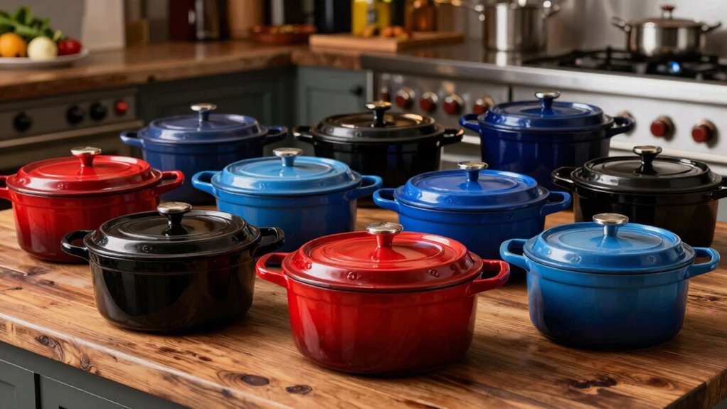 Looking for the 15 best enameled cast iron Dutch ovens for professional chefs in 2026? I’ve researched top models like Lodge, Carote, Umite Chef, and P&P CHEF, which offer durability, even heat, and versatile performance for baking, braising, and roasting. These ovens feature vibrant colors, safety-focused handles, and dishwasher-friendly surfaces, making them perfect for bustling kitchens. Keep exploring, and I’ll guide you through the key features and tips for choosing the right one.