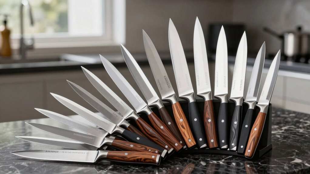 A taller blade on a Gyuto knife can considerably enhance your cutting control, but it also demands more from your grip and technique. The increased height adds weight, boosting cutting power and leverage, which helps when slicing through tough or large ingredients. The extra surface area minimizes sticking, resulting in cleaner cuts and improved efficiency. Plus, the height provides greater stability, giving you better control during delicate or precise tasks. However, because the blade is taller, maintaining accuracy requires a firm grip and proper technique. You’ll need to engage more finger and hand control to keep the knife steady and safe. Ultimately, a taller blade offers better control when used correctly, but it’s essential to adapt your grip to handle the increased size comfortably.