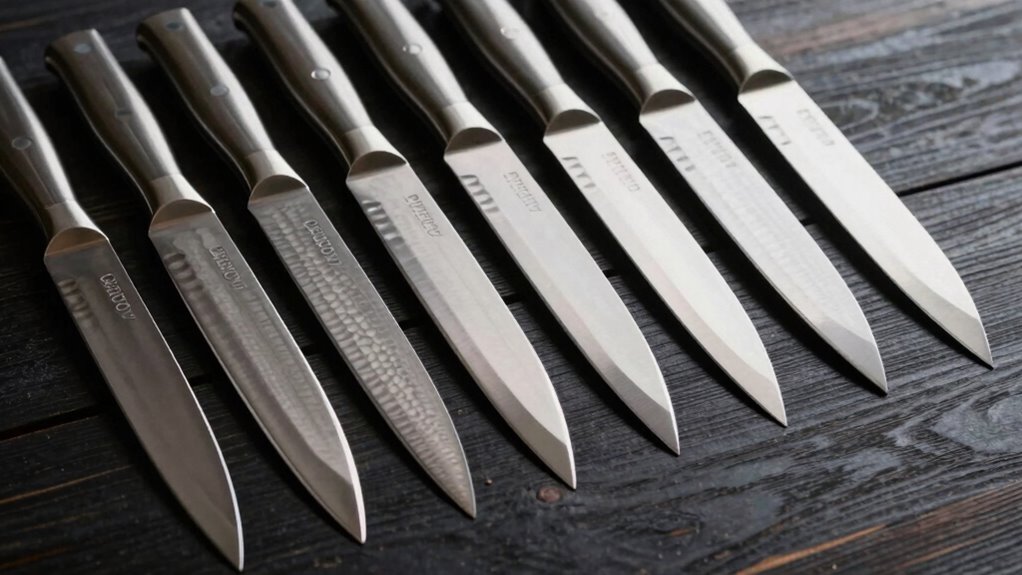 Choosing a gyuto knife with a tsuchime finish starts with paying close attention to the blade material. High-quality knives often feature layered steels like Damascus, which boost durability and add visual appeal. The steel’s composition matters too—look for high carbon content, such as VG10 or AUS-10, for excellent edge retention and sharpness over time. Proper hardening, through heat treatments like nitrogen cooling, is essential to reach a hardness of around 60-62 HRC, ensuring the blade stays sharp longer and resists chipping. Additionally, corrosion-resistant steels help maintain the knife’s appearance and functionality, especially in humid kitchen environments. Layered Damascus steel not only enhances the aesthetic but also improves toughness and resistance to damage during heavy use.