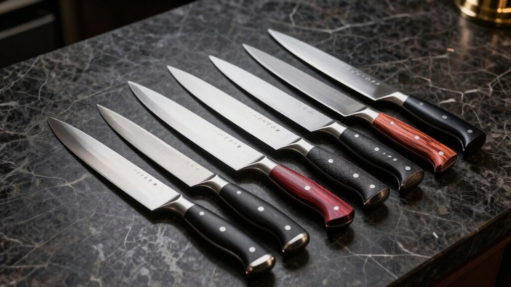 A well-designed handle can make all the difference in how a high-end chef knife feels and performs during use. Comfort is key, especially during long sessions, so I look for handles that reduce hand fatigue and offer a secure grip. Durable materials like Pakkawood, Micarta, or G10 are my go-tos because they resist slipping, even when wet or greasy. The shape of the handle—whether full tang or octagonal—affects control and balance, helping me maneuver precisely. Textured or finger-pointing features boost grip stability, preventing slips during intricate cuts. It’s also important that the handle accommodates different hand sizes and grip styles, ensuring consistent performance without strain. A thoughtfully designed handle truly enhances safety, comfort, and efficiency in the kitchen.
