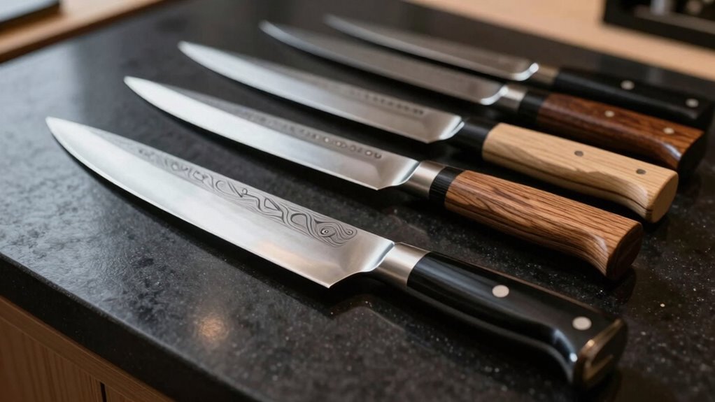 The blade material plays a essential role in determining a Japanese chef knife’s sharpness and durability, especially for left-handed users who rely on precise, consistent cuts. High-carbon steels like White Steel #2 and Blue Steel are popular because they can be sharpened to an incredibly fine edge and are easy to hone, ensuring long-lasting sharpness. Stainless steels such as 5Cr15Mov and Cromova 18 provide excellent corrosion resistance while still maintaining good edge retention. The sharpness of a Japanese knife often comes from a finely tapered, single-bevel edge honed to a 10-15° angle for left-handed blades. The hardness, measured in HRC, directly impacts how well the knife holds its edge over time, making material choice indispensable for ideal performance.