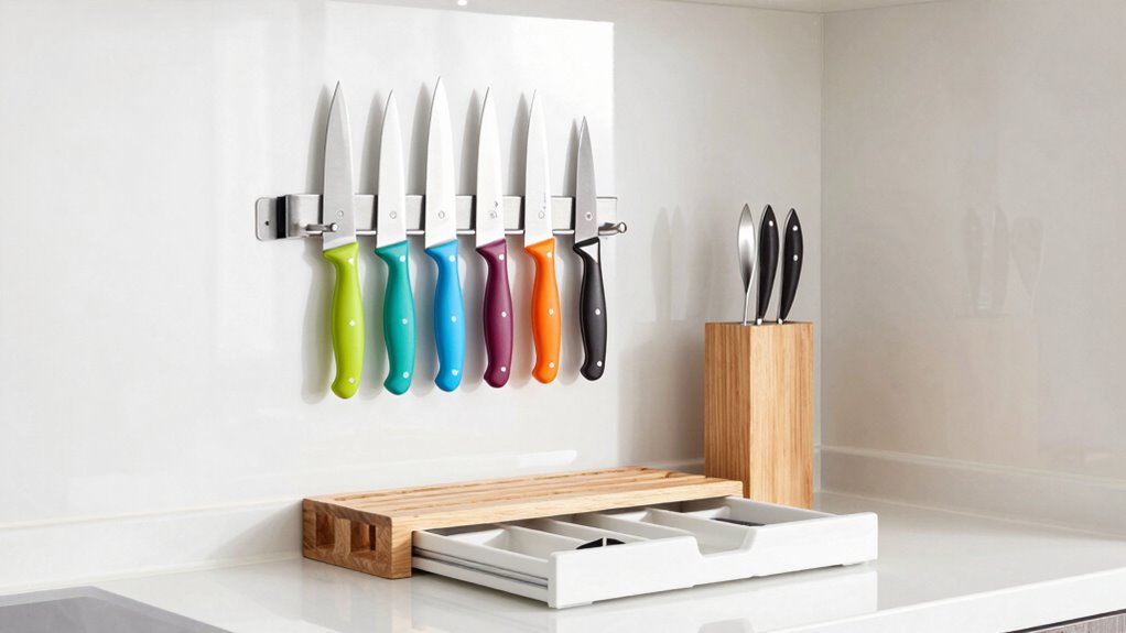 Choosing the right knife storage is like finding the perfect puzzle piece—once it fits, everything feels right. In tiny kitchens, space-saving solutions are a game changer, helping me stay organized without sacrificing style or safety. Whether you opt for a magnetic strip, drawer organizer, or countertop stand, remember that the right choice makes your cooking space feel like a well-oiled machine. Trust me, a little planning turns chaos into calm.