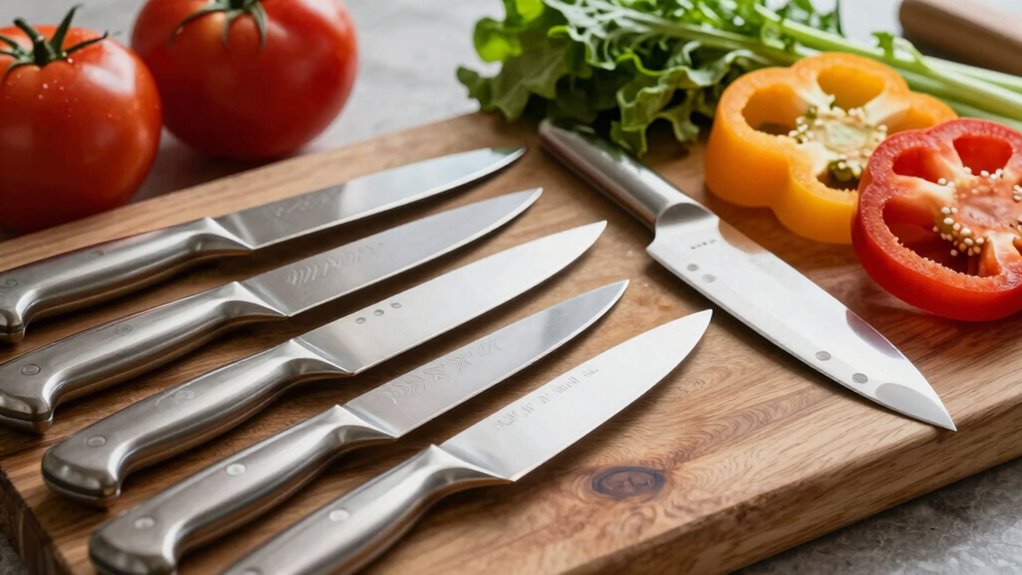 When selecting a knife for vegetable prep, size plays a crucial role in ensuring versatility and ease of use. A blade length between 5 to 7 inches offers the perfect balance of control and adaptability. Smaller knives, around 3 to 4 inches, excel at detailed tasks like peeling, garnishing, or intricate cuts. Larger blades, 6.5 to 7 inches, provide more chopping power and are ideal for slicing or dicing bigger vegetables. The right size allows for smooth handling across various prep techniques, reducing the need for multiple knives. Choosing a versatile size means you’ll be equipped for everything from delicate julienning to bulk chopping, making your vegetable prep more efficient and enjoyable without sacrificing precision or comfort.