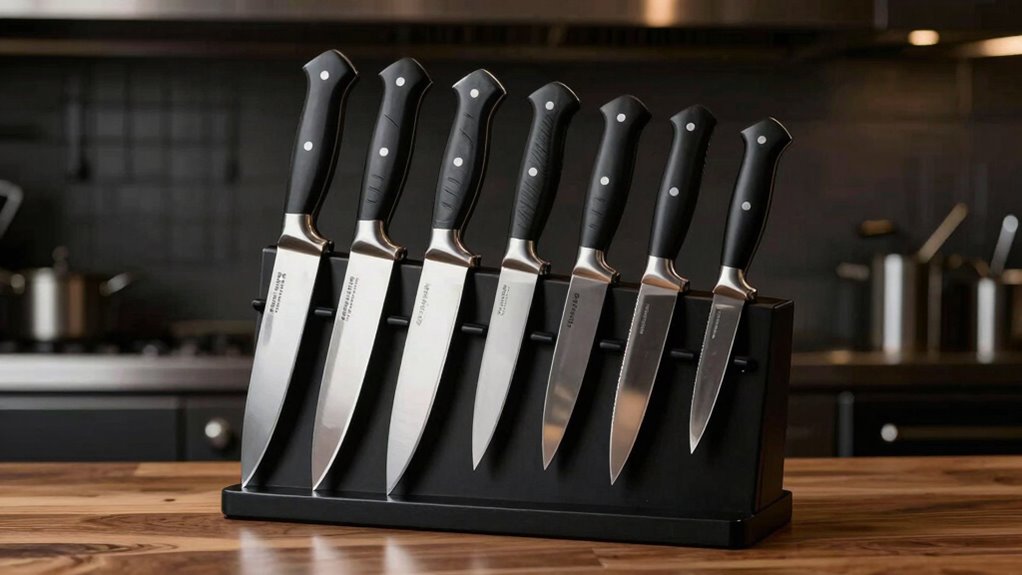 A sharp blade with a finely honed edge makes all the difference in kitchen performance, especially when working with knives under 500. A well-formed edge allows for cleaner cuts and requires less effort, making prep work smoother. The edge angle, usually between 13° and 20°, plays a vital role—sharper angles produce a finer edge but may be less durable. Quality steels with fine-grain structures can be sharpened to achieve better sharpness and hold that edge longer. How you sharpen the knife, whether by hand or professional tools, impacts its final performance. Regular honing and proper maintenance are essential to keep the blade sharp and guarantee consistent cutting power over time. A good edge makes all the difference in efficiency and precision.