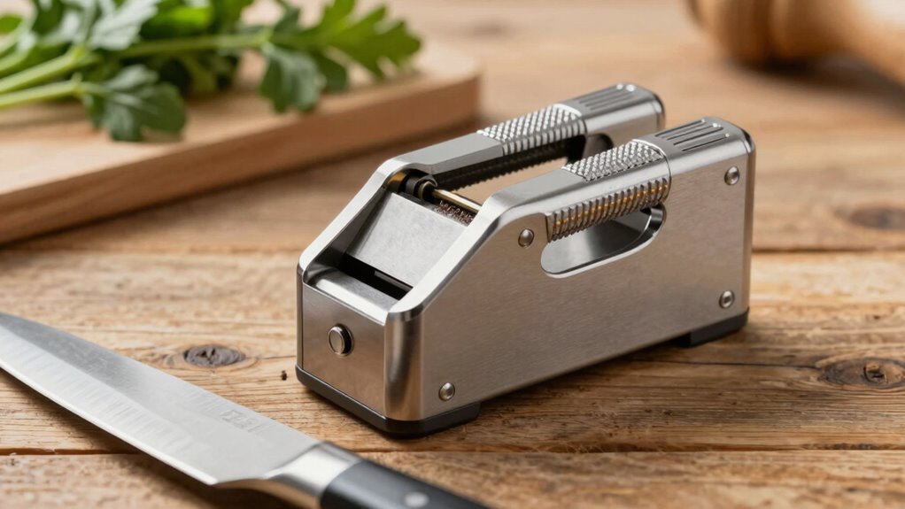 Think of manual sharpeners as the steady heartbeat of a professional kitchen—they’re absolutely suitable. I trust them to bring dull blades back to life, like a craftsman restoring a masterpiece. Their precision and control make them ideal for culinary pros who demand sharpness with every cut. With proper technique, these sharpeners handle daily wear and tear, ensuring my knives perform flawlessly, just as I need them to in high-stakes cooking.