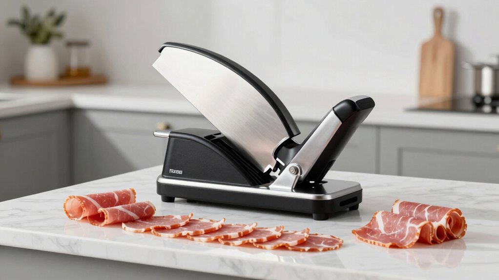 Safety mechanisms are essential when selecting a meat slicer for a small kitchen, as they help prevent accidents and guarantee safe operation. Blade guards and safety locks are indispensable, preventing accidental cuts while slicing. Non-slip suction feet keep the slicer stable on countertops, reducing the risk of slips that could cause injuries. Food pusher guards protect fingers from moving blades, allowing safe handling of food. For households with children, safety features like child lock protections are critical to prevent unintended activation. Additionally, removable safety covers that are easy to clean help minimize debris buildup and promote hygiene. These features not only enhance safety but also make maintenance easier, ensuring the slicer remains a reliable and secure tool in your small kitchen.