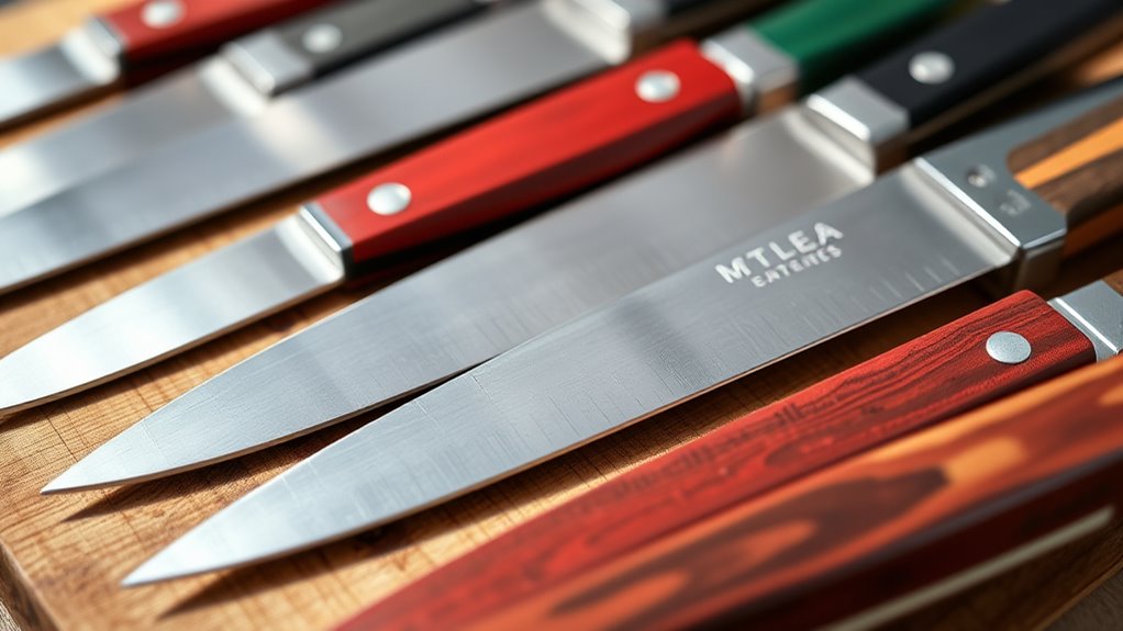 Steel quality and heat treatment play crucial roles in how long a petty knife can stay sharp during vegetable prep. High-quality steel with proper heat treatment creates a harder blade, measured in HRC, that holds its edge longer. Double bevel blades sharpened at around 15° help maintain sharpness through repeated use. Materials like Damascus steel and high-carbon steels outperform standard stainless steel, offering superior edge retention. Regular honing and proper storage also markedly extend the knife’s sharpness lifespan. When choosing a petty knife, prioritize steels known for their durability and ability to retain a razor-sharp edge. This ensures your knife remains effective through extensive vegetable prep, reducing the need for frequent resharpening and making your kitchen work more efficient and enjoyable.