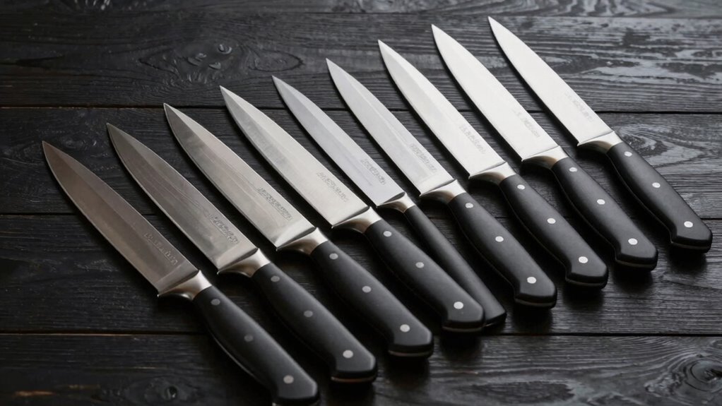 A sharp, well-maintained edge is what transforms a good chef knife into an essential kitchen tool. For powder steel knives under $200, a sharpening angle between 12° and 15° provides a razor-sharp edge perfect for precise cuts. High hardness levels, around 62-64 HRC, guarantee the blade stays sharp longer, reducing frequent sharpening. Hand-polished blades with fine grinding and hollow grinds create a smoother slicing experience by minimizing resistance and preventing food from sticking. The edge should have a consistent, fine bevel to optimize cutting performance and ease of use. Regular maintenance, like honing and proper sharpening techniques, is vital to preserve the blade’s sharpness over time, keeping it performing at its best for all your culinary tasks.