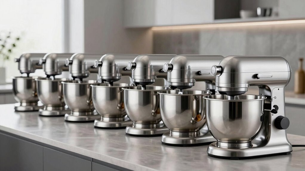 If you’re searching for the 15 best professional bowl lift stand mixers for 2026, I recommend considering models with large capacities like 8 to 10 quarts, durable all-metal construction, and powerful motors ranging from 450W to 800W. Safety features, versatile attachments, and digital controls are also key factors. I’ll share detailed options to help you pick the perfect mixer. Keep going to discover more about these top picks and what makes them stand out.
